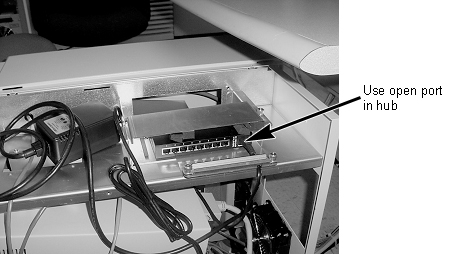 Install the provided network cable between the Stimulus PC network output and the systems cabinet hub located at the top of the systems cabinet. Do not connect the cable at this time. The cable will be connected after the software load.