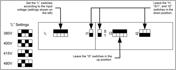 - The following illustration shows the position of the DIP switches for each input voltage selection. Verify that the switches under the letter “L” are configured correctly.