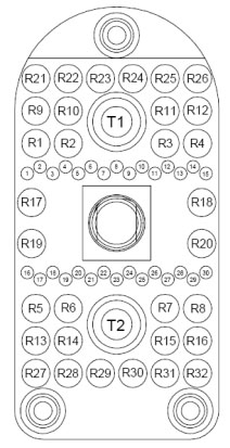 Table 1. Hypertronics/P-Connector Single Connector RF Allocation for Posterior P-Connector Hypertronics Connector SMB Connectors from Cable Trap-Coaxial Cable Color R9 G1 Clear coax R10 G2 Brown coax R11 G3 Red coax R12 G4 Orange coax R13 H1 Yellow coax R14 H2 Black coax Table 2. Hypertronics/P-Connector Single Connector RF Allocation for Anterior P-Connector Hypertronics Connector P-Connector (RF from Left to Right) R1 C1 O6 R2 C2 O1 R3 C3 O4 R4 C4 O3 R5 D1 O5 R6 D2 O2 Figure 7. Anterior P-Connector RF Allocation