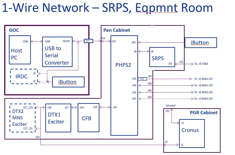 The PHPS2 module is the central hub of 1-wire communication. All 1-Wire communication paths ultimately connect at the PHPS2. The PHPS2 must be connected and powered on to permit any communication on the 1-Wire network. The PHPS2 is responsible for receiving 1-wire data from all the 1-wire devices and then converting this data to RS422 serial. This serial data is then forwarded from the PHPS2 to the Host PC through the Serial-to-USB converter box located in the rear of the GOC. The direction of information travel is reversed for any data the Host PC forwards to any 1-wire device on the network; that is, the Host PC forwards information to PHPS2, then PHPS2 forwards to 1-wire device.