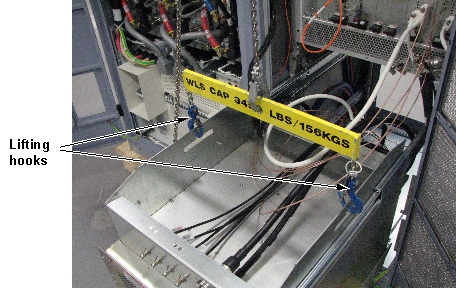 Move the new XRFD amplifier near the cabinet and attach the hoist brackets to the new RF amplifier using three screws per bracket. See Figure 22.Notice - Connect the lifting hooks to the hoist brackets.