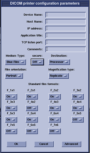 Note: The secure option can ONLY be set to On in case the third-party certificate from the printer is available and is imported into the MR System through certificate management. This will enable DICOM over TLS printing. For more information, see Importing and exporting TLS certificates.Figure 6. DICOM printer configuration parameters window