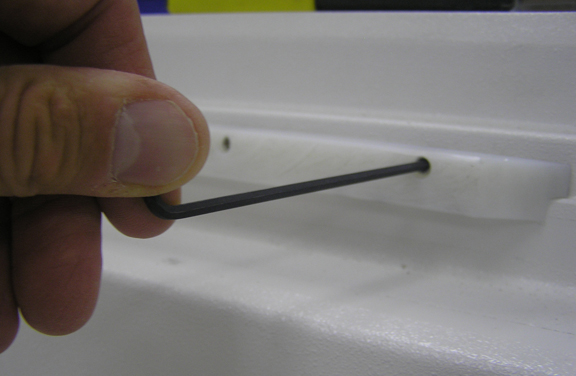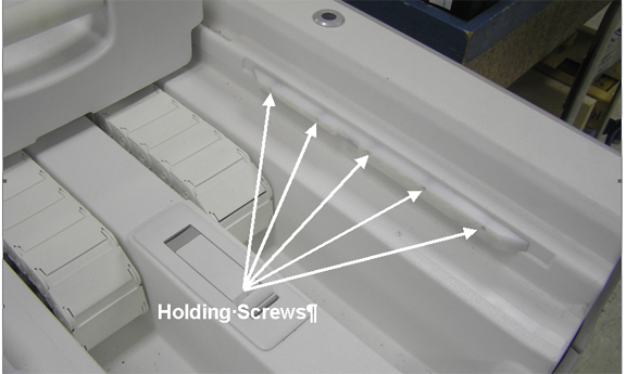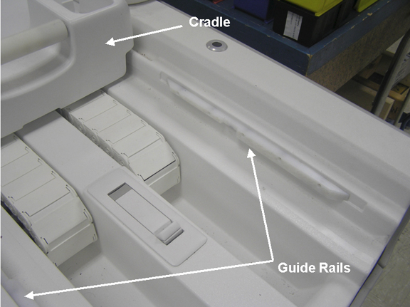Two guide rails (LH and RH) are used to guide the cradle when moving the cradle forward and backward on the table top. Fives screws secure each guide rail to the table top. Each screw mounts through the guide rail and table top to the nut bar. The nut bar is not secured to the table top. To prevent the nut bar from dropping into the table top, always have two screws mounted. Carefully follow each step in this procedure to make sure the nut bar does not drop into the table top during removal or installation. If nut bar drops into the table top, the bottom panel of the table top must be removed to retrieve the nut bar.