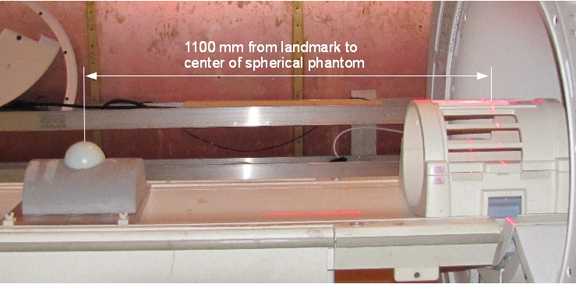3. (For curved table) Place an EPI Grafidy foam positioner and a 100 mm sphere in the positioner. Move the table into the bore to 1100 mm from landmark. Slide the Grafidy base plate so the center of the 100 mm sphere is at the axial alignment light, and then press the MOVE TO SCAN button.
