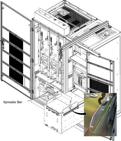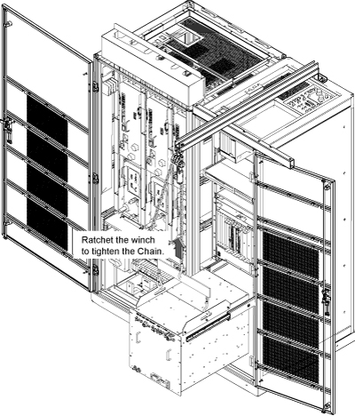 Ratchet the winch to tighten the chains and begin lifting the unit. Slide out the rail a short amount to determine how high to lift the dual drive RF amplifier. The dual drive RF amplifier slide rails and the cabinet slide rails must align for correct insertion.