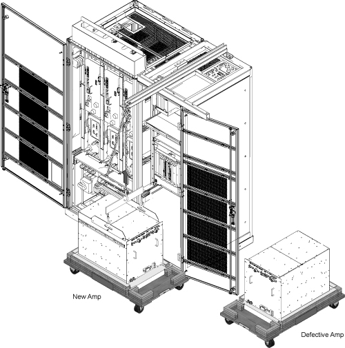 Roll the removed dual drive RF amplifier to the side. Later, it will need to be purged of water coolant before being packaged for return.