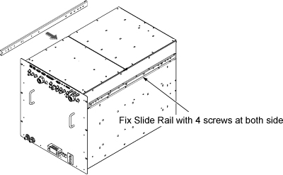 With the dual drive RF amplifier unit supported by the hoist kit, unscrew the four screws and remove the slide rails from both sides.