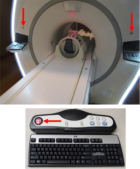 The PDU EMERGENCY STOP buttons are located on the Operator Workspace Keyboard and on the Magnet Enclosure front cover (two buttons, left and right). A SYSTEM OFF button is located on the System Main Disconnect Panel.