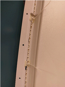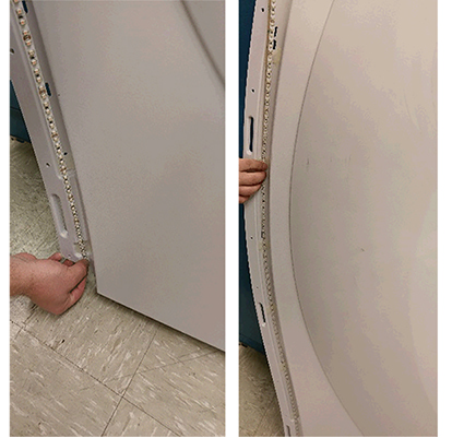 Install the LED strip starting from the bottom to the top of the panel, pealing the backing off the LED strip (approximately 12 inches) to expose the adhesive tape, and continuing up the side as the LED strip is placed. Between adhesive mounts, make sure to press the LED onto the cover to eliminate any gaps.