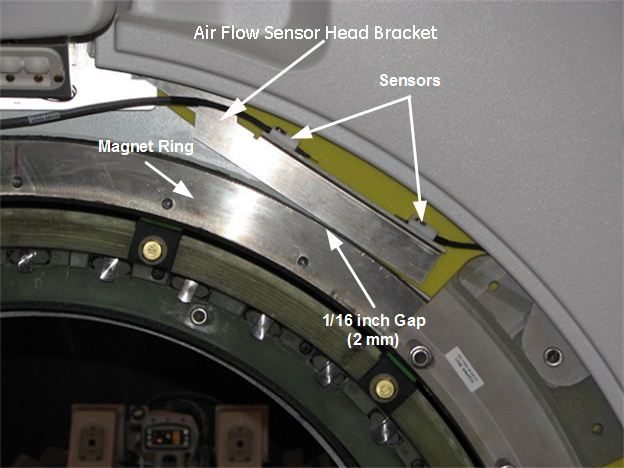 Make sure the air flow sensor is all the way behind the front end bell, but not touching the magnet ring (see Figure 3). To adjust, move the sensor head bracket down until the it touches the magnet ring, then move it up 1/16 inch (2 mm).