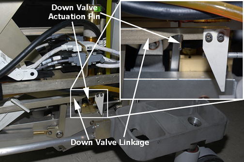 3. Prepare the replacement cylinder for installation by pressing the cylinder to its fully retracted position. (It may be necessary to move the linkage to fit the actuation pin of the down valve into the groove of the linkage.)