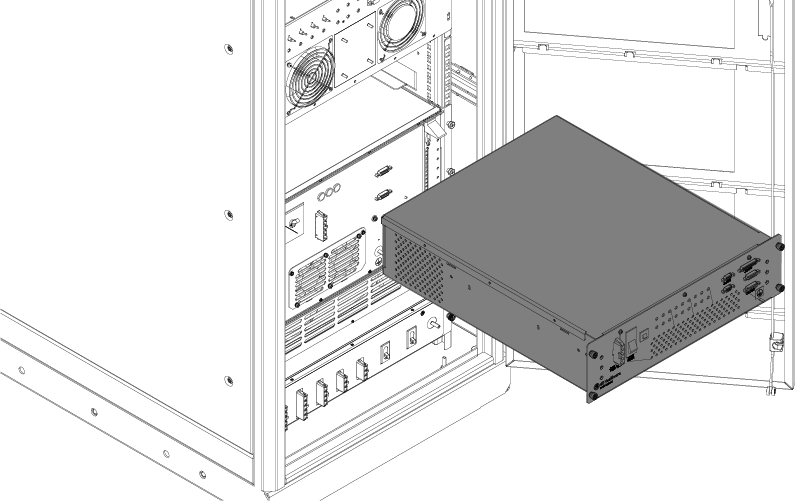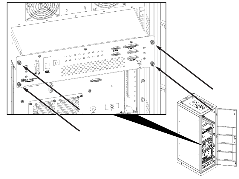 Optima MR450w BASE 1.5T System Service Methods 5690012-2EN Revision 3 Object ID: 00000018WIA30931810GYZTopic ID: id_2005883 Version: 1.13Date: May 27, 2021 12:21:55 PMInstalling the Patient Handling Power Supply (PHPS) 2 ProcedureInstall the sub-D filters onto connectors J35, J36, and J54.Install the PHPS 2. Figure 1. PHPS 2 placement Connect the cables to the rear of the PHPS 2.Connect the fiber optic cable to the rear of the fiber optic interface.Slowly push the PHPS 2 all the way in. Note: Use caution to not pinch or damage the eight cables or impair the cable service loops at the rear. Tighten four captive fasteners. Figure 2. Four captive fasteners Connect the cables to the front of the PHPS 2. Make sure the PHPS 2 front power switch is in the up (on) position.Close or reinstall the penetration cabinet door.