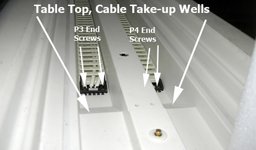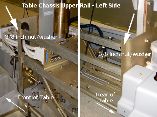 Standing at rear of the table, the right side is the P3 cable take-up, and the left side is the P4 cable take-up. To make accessing the P4 connectors on the TIP easier, remove the 3/8 inch nut and washer from the front and rear of upper chassis rail.