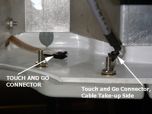 Although only one cable take-up is being replaced, this step requires removal of both cable take-up connections from the bottom rear of the cradle because the cradle must be removed from the patient table to access the cable take-up in the track wells.