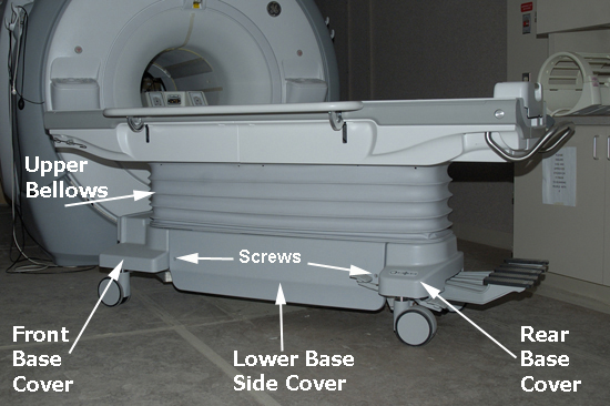Undock the patient table and use the non-ferrous Phillips screwdriver to replace the lower base side cover, then place the upper bellows in the down position.