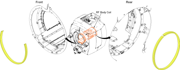 Slide in the new RF body coil (shown below) with the blue drive cables facing the rear end. Align the mounting pads on the body to the centering strips inside the gradient coil.
