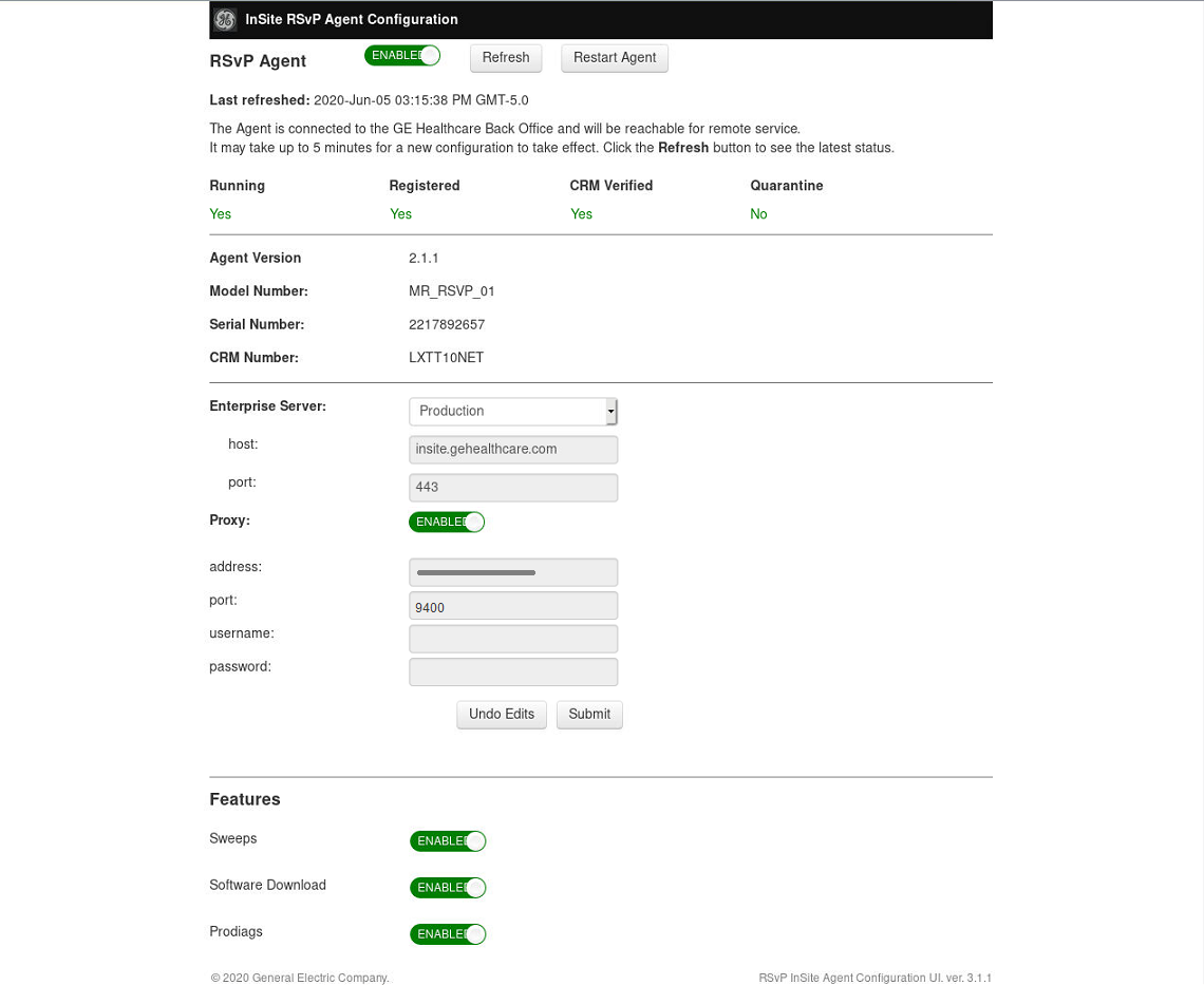 Note: If a customer insists on using GE InSite Proxy server IP address, then obtain approval for this form of connectivity from the local connectivity team and configure the GE Proxy IP in this UI. This Proxy Server IP address is typically 150.2.1.251 with Port: 8002. Confirm this IP address and port# with your local connectivity team.