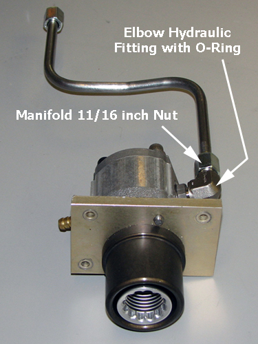 - On the right side of the pump, use an 11/16 inch open-end wrench to disconnect the manifold nut from the connector fitting .Note: Use a towel as plug to stop flow of fluid.