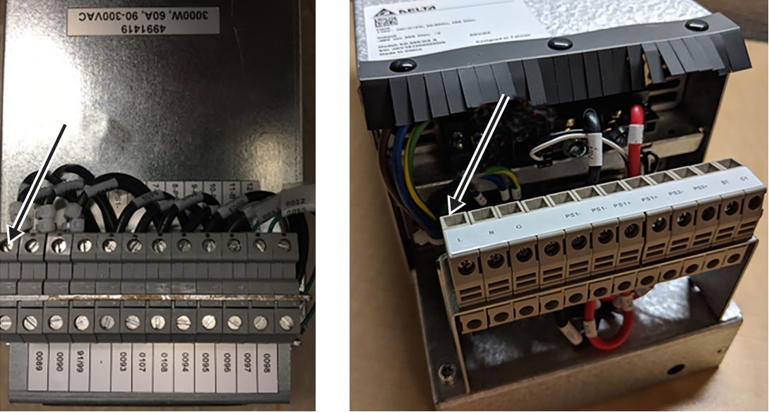 - Attach the marked wires to the terminal block on the Delta power supply bracket, matching the wire labels to the labels on the bracket.Note: The Delta labeling shows the run number and the terminal block number with description (pin 1 is on the left).