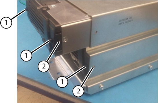 1 Slide buttons 2 Mounting pins - Tighten the bottom three screws on the side of the power supply bracket.