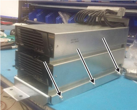 - For both XGD and XGD2, remove the three 10-32 x 1/2 screws from the PDU receptacle assembly, which is on the bottom of the unit.Note: If you are replacing a faulty Delta power supply in an existing blind-mate bracket assembly, you do not need to remove these screws; in a subsequent step you will unlock the mounting pins to remove the power supply.Note: Do not recycle the screws, as you will use them to reattach the assembly.
