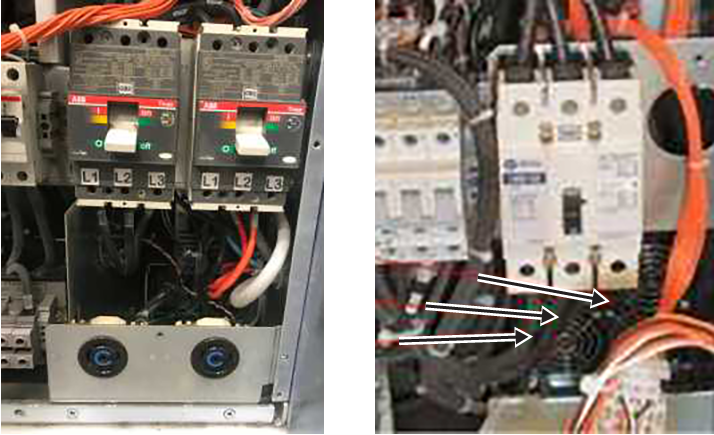 Figure 8. Impeding wires attached to circuit breakers - XGD (left) and XGD2 (right)
