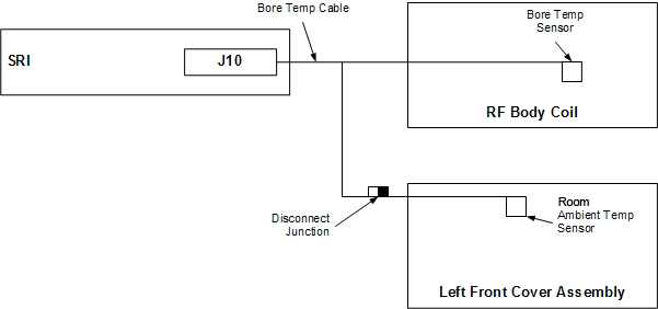 This procedure describes the replacement of the two temperature sensors associated with the magnet. The room ambient temperature sensor is located in the left front cover. The room ambient temperature sensor is clamped into the left cover, so the sensor can be replaced without replacing the cover. The patient bore temperature sensor is located inside the RF body coil. The room ambient temperature cable plugs into the bore temperature cable Figure 1. The bore temperature cable then connects to the SRI at J10.