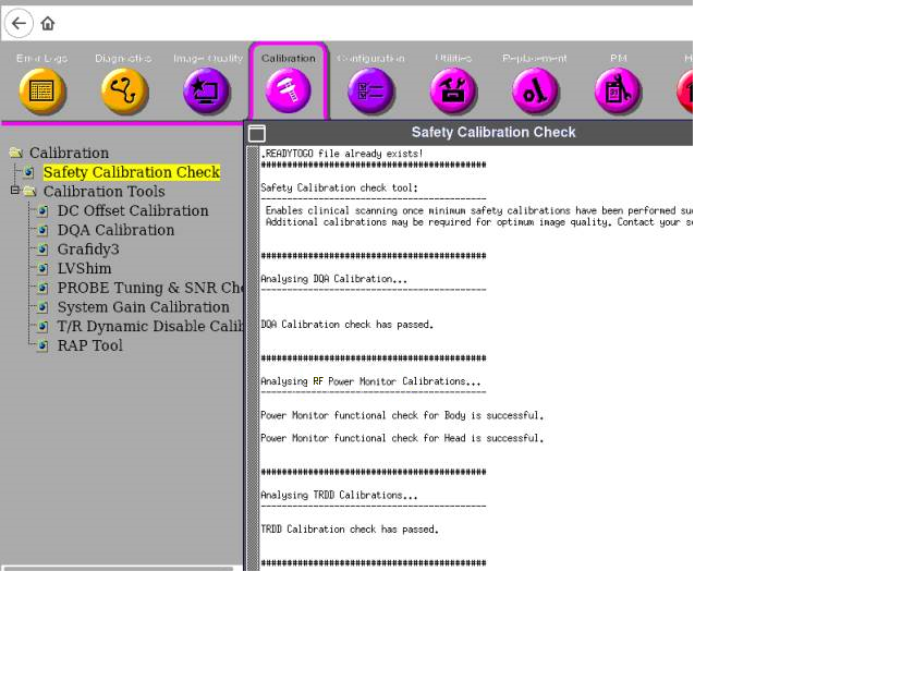 The Safety Calibration Check is used to check the calibration status of the scanner in non-proprietary mode and enables the scanner for clinical scanning if the calibrations are passed. This check requires that the minimum calibrations have been completed adequately in order to operate the system. Further calibrations will be required if greater image quality is desired. When the check is passed, clinical scanning can commence.