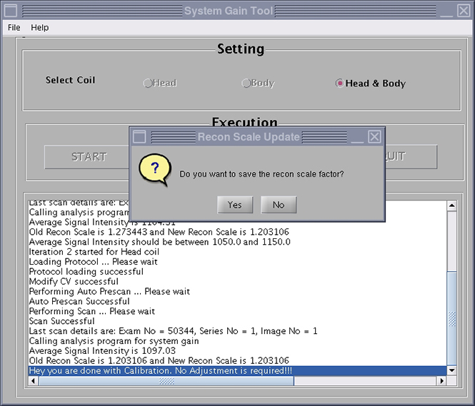 System gain calibration is performed to determine the standard head (transmit/receive coil) and body recon scale factors that will achieve a known level of image intensity when using the standard head coil or body coil with a known phantom solution and protocol. The goal is that when the same solution or tissue is scanned in either the standard head or body coil with the same protocol, those tissues will have approximately the same image intensity level on a given system and between systems of like type.