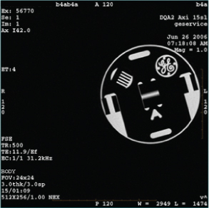 - If the latest exam has its image(s) labeled Axial, the tool has made an early detection of a Z gradient polarity problem from the set of multi-slice images. Check to see if the central bar feature (in Figure 2) moves toward the resolution comb feature as the slice location moves from inferior to superior.
