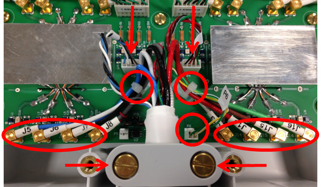 Install all channel connections (8 coaxial and 3 DC connectors) by matching the designators on the cable with the designators on the PCB. Tie cables J5, J6, J7 and J8 to the left cable tie holder on the PCB. Tie cables J13, J14, J15, J16, and P6 to the right cable tie holder. Route the cables as shown in the picture, so none of them touches the rectangular shield. Cables P3 and P4 should not be tied.