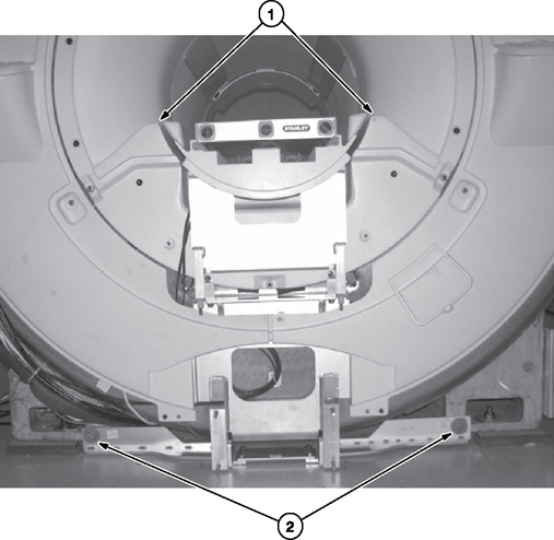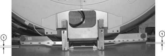 - Align the bridge in the X-direction (left/right in the magnet bore) by shifting the entire front bridge support assembly until the distance between the bridge and RF body coil is equal on both sides of the bridge. It may be necessary to loosen the two M10 bolts that fasten the bridge support assembly to the magnet feet. Notice: The bridge must not be in contact with the RF body coil along its entire length.