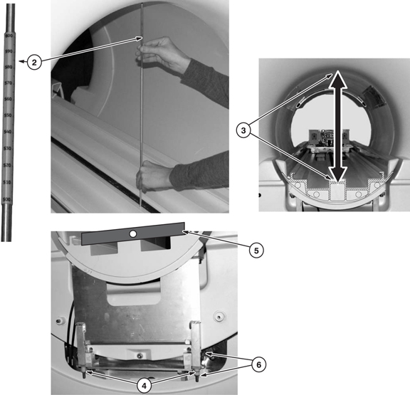 These steps provide instruction to use the bridge height gauge to align the bridge in the Y-direction (up/down in the magnet bore) to attain 582 mm - 585 mm between the top of the patient bore and the bridge surface.