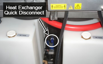Note:The primary cooling loop is drained from the HEC through the gradient coil heat exchanger quick disconnect or the power electronics quick disconnect located at the bottom of each heat exchanger shown in Figure 4. (The power electronics quick disconnect is located to the right of the power electronics tank in a position similar to the gradient coil tank.)
