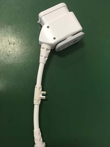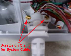 Place the new system cable on the HNU coil with the flat side of the strain relief facing up and the curved side facing down, and secure in the cable clamp with the screws just removed.