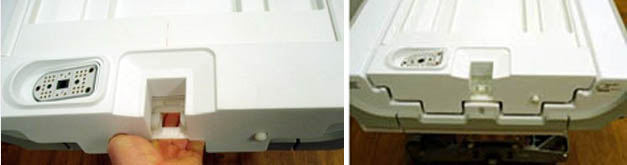 Continue pushing in both buttons, and pull the cradle toward you until a click is heard and the cradle stops moving.