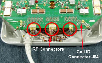 - Place the new system cable on the PV coil, ensuring that the flat side of the strain relief is facing down, and reconnect the RF connectors labeled J33, J34, J35, and J36.
