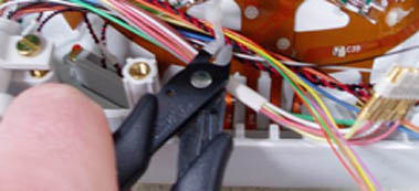 - Remove the twisted pair DC connector labeled J83 by pushing in on the clip and pulling the connector straight up from the board.