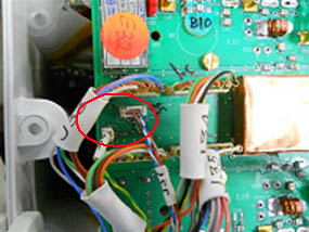 - Remove the coil ID connector labeled J54, located under the board in the lower right corner, by pushing in on the clip and pulling downward on the connector.