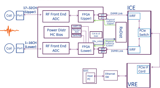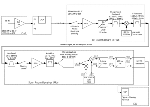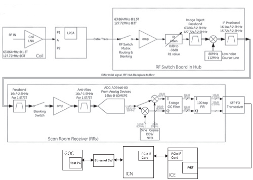 The receive chain takes the low-level analog signal from the MR coils and digitizes it for reconstruction to create an image. Coil ports are connected to the receive electronics through cable tracks which carry RF and coil communications. In systems equipped with the RF hub architecture, the RF cables are connected to the RF switchboards which provide gain control. The signal then goes through a mixer module, where the proton frequency is downconverted to a ~16 MHz Intermediate Frequency. The signal is then output from the mixer module as a differential signal to the remote receiver (RRx). The RRx and DPP receiver work in a similar manner, digitizing and then decimating and filtering the data. The digital data is sent through a SFP fiber optic transceiver to either the iVRF within the ICE chassis or to the VRF board within the VRE chassis. The iVRF/VRF does more digital filtering, adjusts the R2 gain stage, and hands the data off to VRE. The VRE then reconstructs the data into an image and transfers it via Ethernet to the GOC, where it is displayed on the operator monitor.