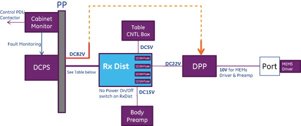 Receive single DV22V power from DCPS and RxDist distributes the power to receiver of each port module. On-board power is regulated individually.
