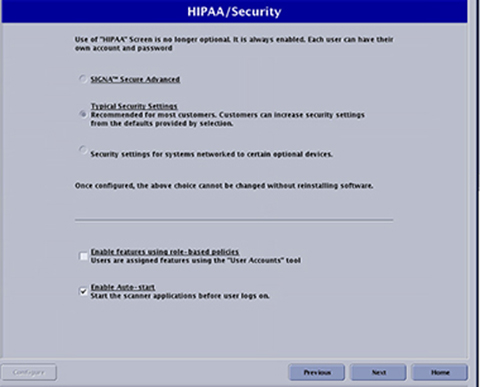 (For DV25.1 and earlier) Typical Security Settings is the recommended security level unless the customer has system-networked options, such as FUS, BrainWave (with STIM PC), CADStream, MR Touch, or other third-party devices. In that case, select Security settings for systems networked to certain optional devices.