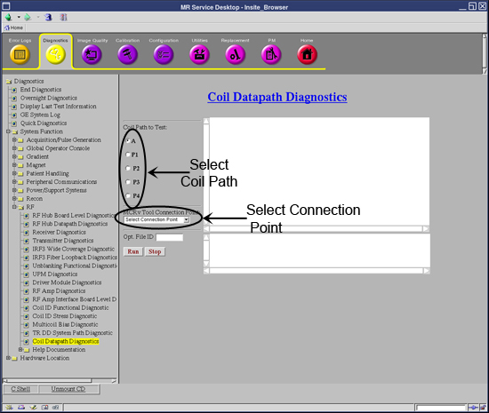 Under the Diagnostics tab, select System Function, RF, and Coil Data Path Diagnostics.