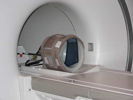 - Place the phantom with loader on the table; place the coil on top of the phantom loader, and plug the flex coil into Port A.