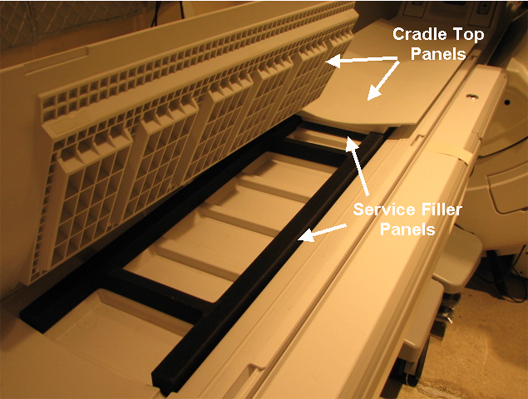 (For curved table) Remove service filler panels from each cradle top panel.