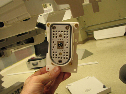 - Each P-port cover (front and rear) is attached by a rubber tether. Remove the P-port cover by gently tugging its tether to pull it out.