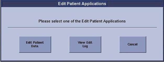 Note: If you have started the edit process and the number of images in the examination changes before the data is updated, exit the edit function and try again. This could happen if you start to edit the patient data, then enter the Add/Subtract application and add images to the examination. When the edits are accepted, an error message shows.