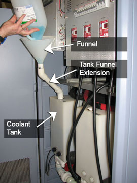 - When finished filling the tanks with coolant, place the funnel and tank funnel extension at the bottom of the HEC.