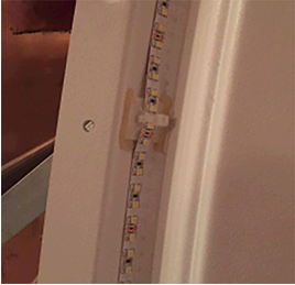 Install the LED strip starting from the bottom to the top of the panel, pealing the backing off the LED strip (approximately 12 inches) to expose the adhesive tape, and continuing up the side as the LED strip is placed. Between adhesive mounts, make sure to press the LED onto the cover to eliminate any gaps.