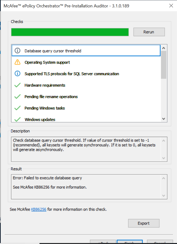The Pre-Installation Auditor now starts automatically. This is the client’s installation diagnosis tool, aiming to make sure proper data flow can occur between the SQL server and the ePO. Review the results and correct any failures or warnings. Refer to the documents linked by the client if needed. Click Rerun. After all checks have passed, click Finish.